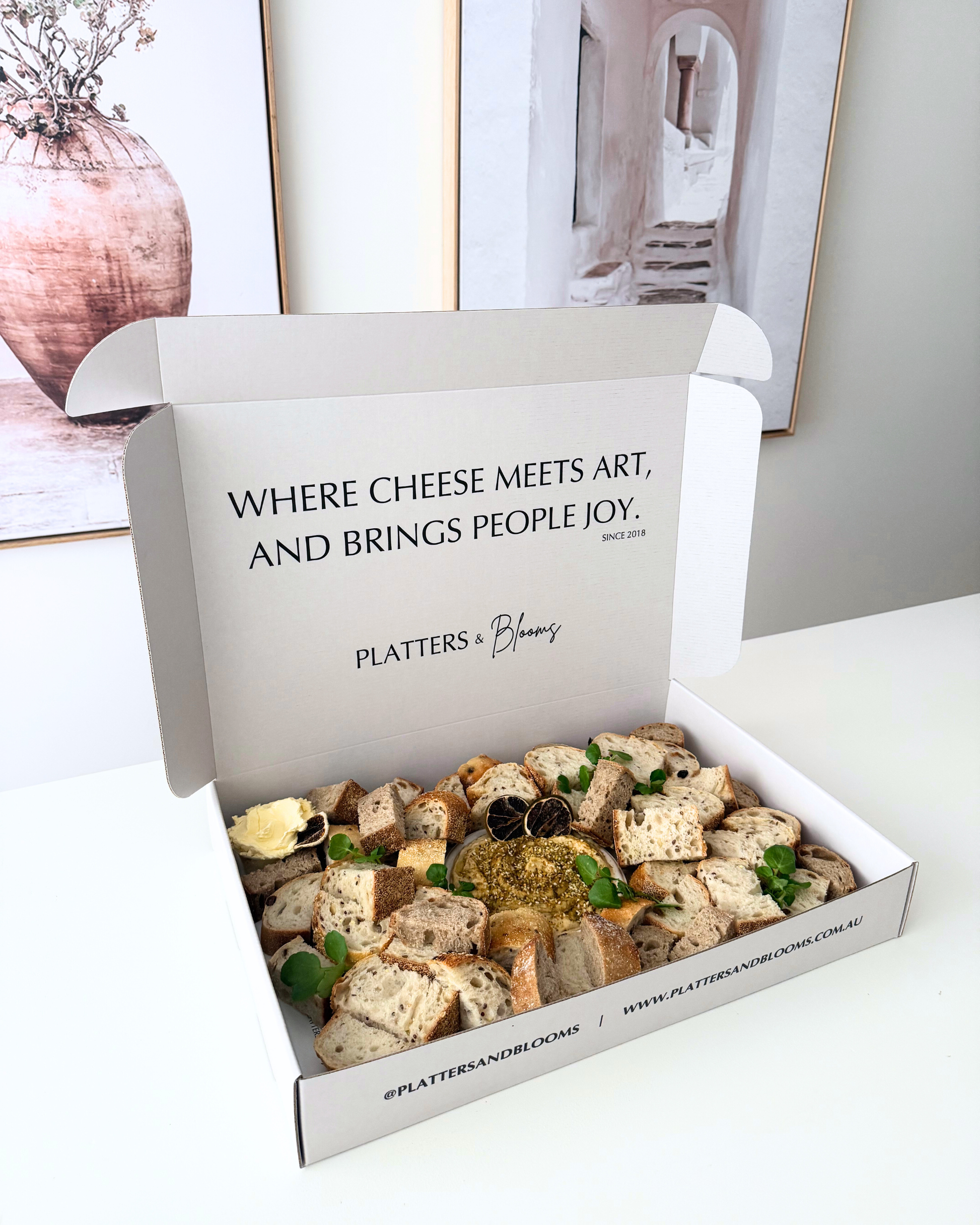 Our platter boxes arrive ready to eat in a protective box, on a removable board for styling. Each box comes standard with disposable wooden knives for serving.